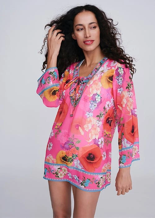 The new Copacabana Cover Up, named for both the famous beach in Rio and the even more famous night club in New York, is every bit as dazzling and gorgeous as its namesakes. This item has 3/4 length sleeves for a combo of coverage and a very relaxed fit. This cover up has a gorgeous colour scheme and is full to the brim with detail of the realistic floral print. It is among the most lively and charming of all the new Pia Rossini designs, and we adore it.